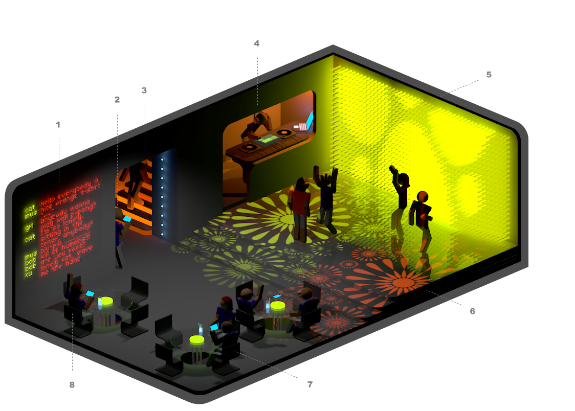 The DJ controls the lighting and kinetic effects on the dance floor. In fact, the dance floor itself also reacts to the clubbers’ mood.